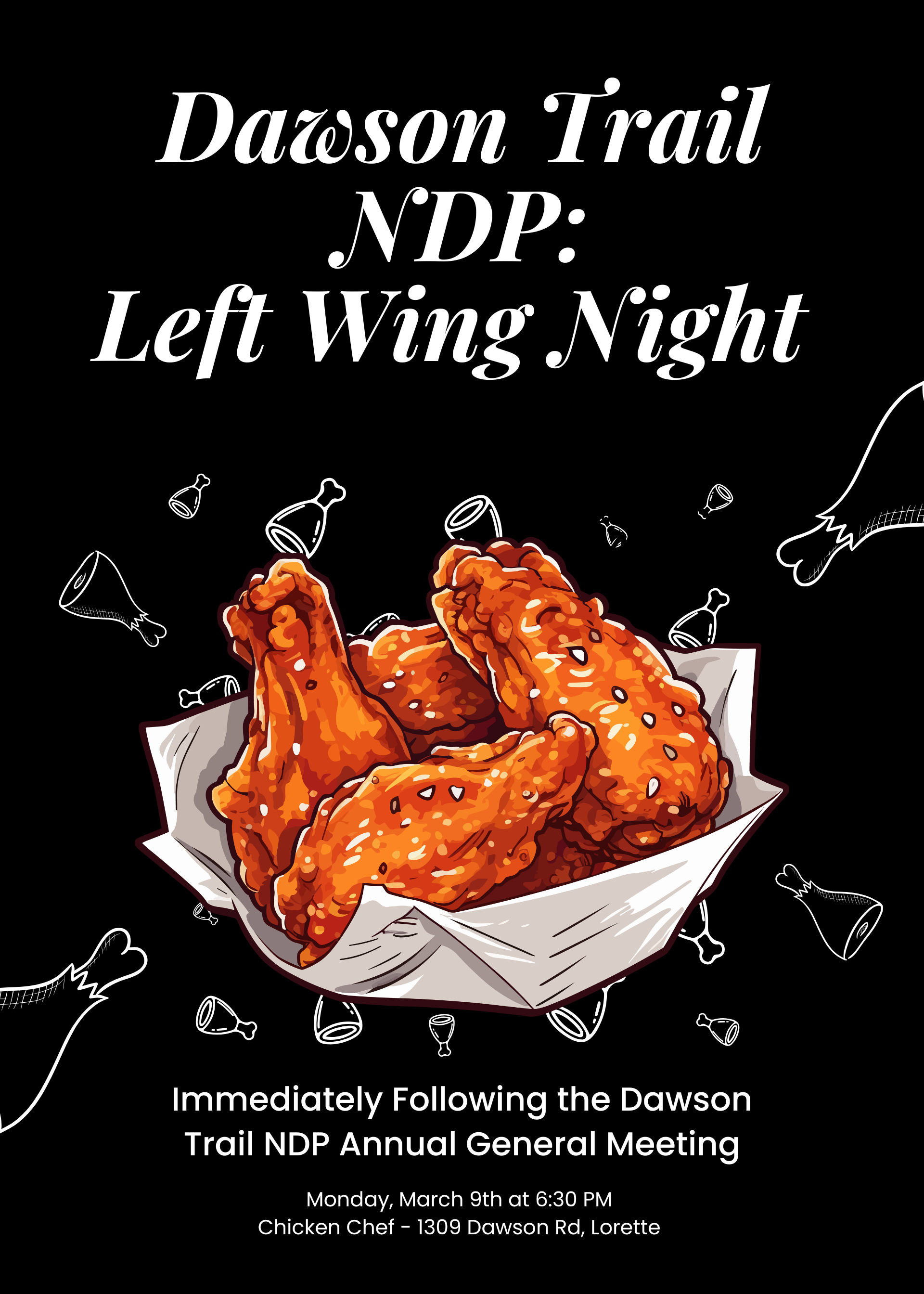 Join the Dawson Trail NDP for an all you can eat buffet of chicken wings and pizza immediately following the Dawson Trail AGM