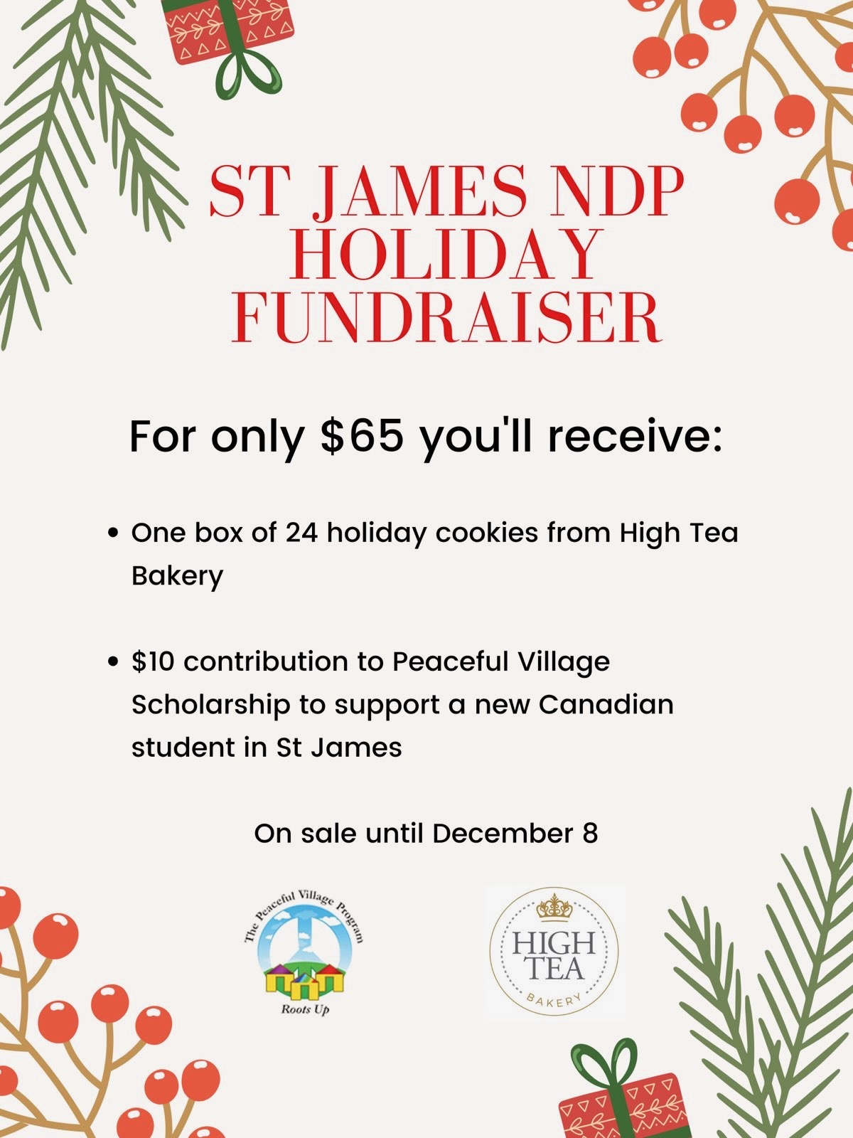 It's once again time for our annual St. James Holiday Fundraiser. With a $65 donation, you'll receive one box of 24 delicious assorted cookies from High Tea Bakery, a local St. James business.