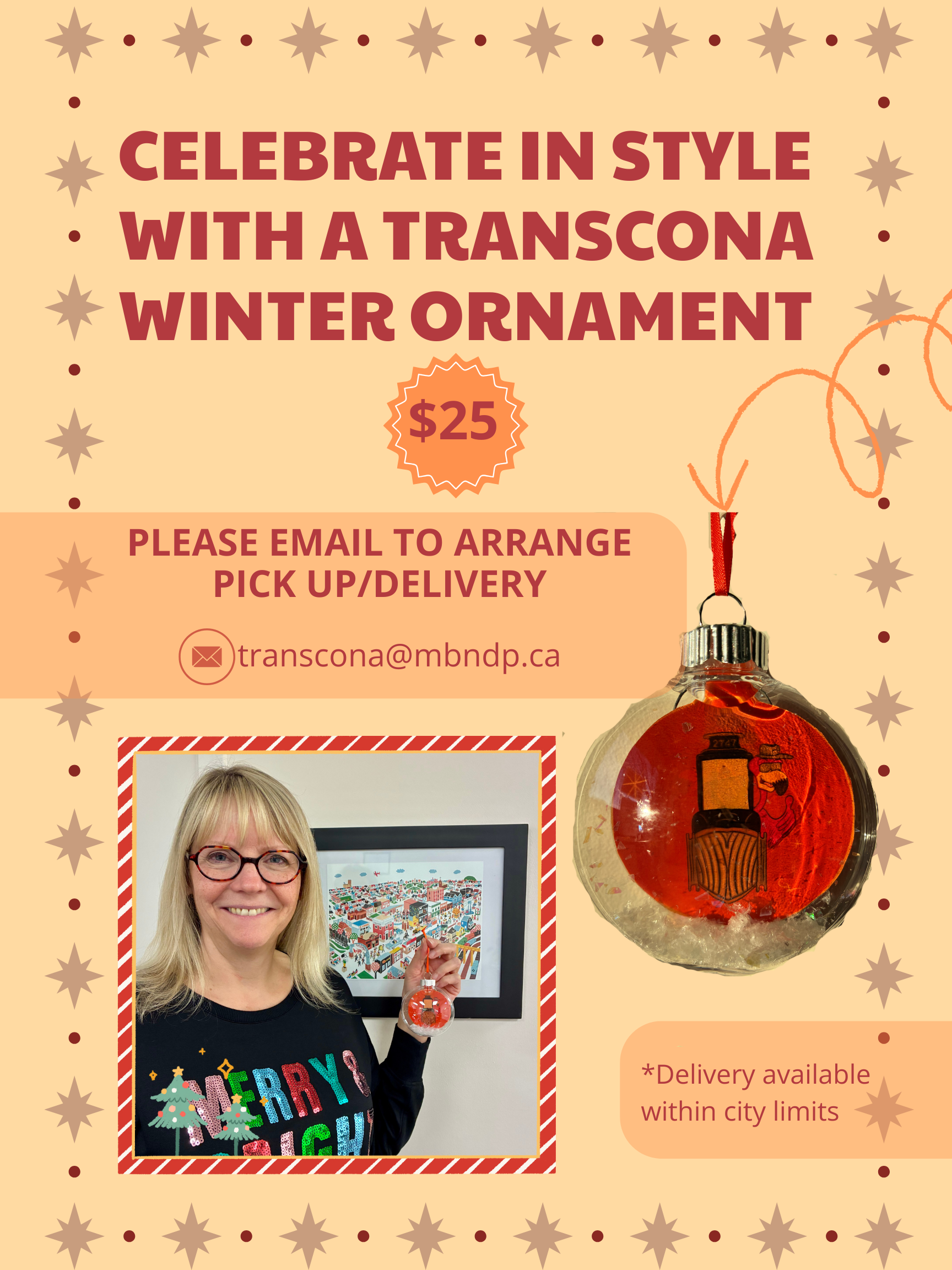 Help support Shannon Corbett and the Transcona NDP and celebrate in style with your new Transcona winter ornament!
